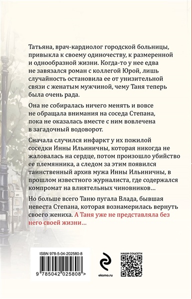 Татьяна, врач-кардиолог городской больницы, привыкла к своему одиночеству, к размеренной и однообразной жизни. Когда-то у нее едва не завязался роман с коллегой Юрой, лишь случайность остановила ее от унизительной связи с женатым мужчиной, чему Таня теперь была очень рада. Она не собиралась ничего менять и вовсе не обращала внимания на соседа Степана, пока не оказалась вместе с ним вовлечена в загадочный водоворот. Сначала случился инфаркт у их пожилой соседки Инны Ильиничны, которая никогда не жаловалась на сердце, потом произошло убийство ее племянника, а следом за этим появился таинственный архив мужа Инны Ильиничны, в прошлом известного журналиста, где содержался компромат на влиятельных чиновников… Но больше всего Таню пугала Влада, бывшая невеста Степана, которая вознамерилась вернуть своего жениха. А Таня уже не представляла без него своей жизни… Татьяна Устинова рекомендует: «Удивительно, но в книгах Евгении Горской угадывается настроение больших русских романов. Она умещает в детектив современную энциклопедию разнообразнейших губительных страстей, созидательных любовей и ярких, живых, разноголосых героев. Получается не только интересно и зажигательно, но еще и очень по-настоящему — ровно настолько, чтобы захотелось поверить в эту историю. Горская ловко и умеючи держит читателя в напряжении: тебе иногда страшно, иногда смешно, иногда будто бы совсем безнадежно, но в конечном итоге понимаешь: все будет хорошо!»