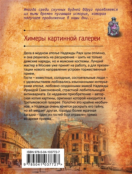 Дела в модном ателье Надежды Раух шли отлично, и она решилась на расширение — шить не только дамские наряды, но и мужские костюмы. Лучший мастер в Москве уже принят на работу, а для презентации нового направления устроен торжественный прием. Гости —известные, солидные, состоятельные люди — с удовольствием любовались изысканными интерьерами ателье, любовно созданными мамой Надежды Ираидой Самсоновной, страстной любительницей антиквариата. Ее недавнее приобретение — авторская копия картины, оригинал которой находится в Третьяковской галерее. Полотно это крайне необычное, и Надежде очень хочется раскрыть его тайну, но ей мешает другая, гораздо более мрачная загадка — один из гостей был отравлен прямо во время приема…
