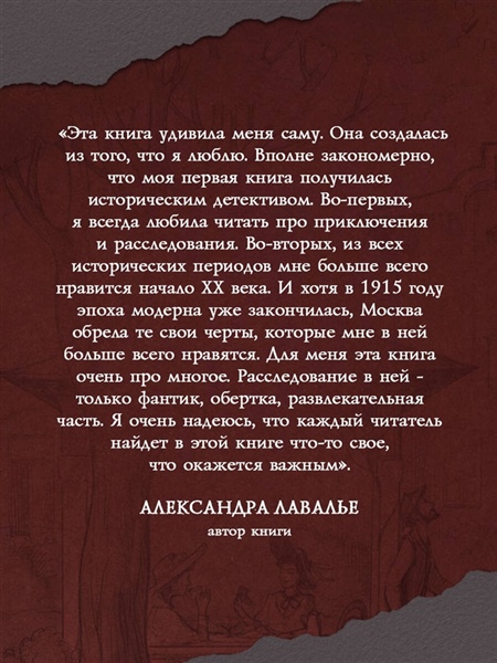 Для поклонников «Графа Аверина», «Визионера» и расследований Шерлока Холмса: в предреволюционной Москве начинается новое расследование... Москва, 1915 год. Молодой военный хирург Алексей Эйлер возвращается с фронта и едет к матери друга, которого не смог спасти. Но она неожиданно признается ему в убийстве собственного мужа… Вскоре происходит новое убийство, и в нем обвиняют Алексея. Чтобы защититься, он вынужден сам взяться за расследование дела. В партнеры к нему набивается журналист бульварного издания. Выясняется, что все не так просто, и герой встает перед выбором: выдать убийцу или оказаться на каторге самому. «Необычный исторический период, неоднозначные персонажи, живописные декорации предреволюционной Москвы, таинственная атмосфера и увлекательное повествование — ретро-детектив, который стоит прочитать». — Игорь Евдокимов, автор циклов «Тайный архив Корсакова» и «Доктор Фальк»
