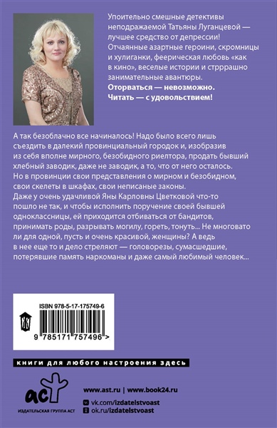 А так безоблачно всё начиналось! Надо было всего лишь съездить в далекий провинциальный городок и, изобразив из себя вполне мирного безобидного риелтора, продать бывший хлебный заводик, даже не заводик, а то, что от него осталось. Но в провинции свои представления о мирном и безобидном, свои скелеты в шкафах, свои неписанные законы. Даже у очень удачливой Яны Карловны Цветковой что-то пошло не так, и чтобы исполнить поручение своей бывшей одноклассницы, ей приходится отбиваться от бандитов, принимать роды, разрывать могилу, гореть, тонуть… Не многовато ли для одной, пусть и очень красивой, женщины? А ведь в нее еще то и дело стреляют — головорезы, сумасшедшие, потерявшие память наркоманы и даже самый любимый человек…