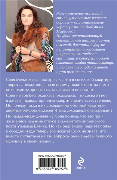 Соня Менделеева подозревала, что в соседской квартире творится неладное. Иначе почему пожилого отца и его не вполне здорового сына так давно не видно? Соня не зря беспокоилась: оказалось, что соседей нет в живых, правда, причины смерти вполне естественные. Но почему тогда в их совершенно обычной квартире двойные сейфовые двери? Что за сокровище она скрывает? По найденному дневнику Соня поняла, что это прижизненное издание стихов знаменитого английского поэта Уильяма Блейка. Но как редчайший раритет попал к соседям и где теперь его искать? Соня не знала, что вместе с ответами на эти вопросы она найдет и главного мужчину в своей жизни…