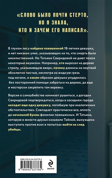 Продолжение сериала «По имени Тайна» с участием полюбившихся героев Татьяны Поляковой. Ироничный роман о хрупком равновесии между истиной и ложью, где каждый хранит свою тайну. Это история с динамичным сюжетом и сильной героиней, которая замечает то, что не видят другие, даже перед лицом пугающей правды. Роман, где каждая деталь усиливает напряжение, затягивает в мир тайн и загадок, где на кону оказывается сама истина. В глухом лесу найдена повешенной 18-летняя девушка, и нет никаких улик, указывающих на то, что смерть была насильственной. Но Татьяне Свиридовой — инструктору по физической подготовке, временно исполняющей обязанности ушедшего на больничный следователя, — не дают покоя некоторые неувязки. Например, кто вырезал на дереве стрелу, указывающую вверх, почему джинсы на мертвой абсолютно чистые, несмотря на жидкую грязь под ногами, и каким образом девушка умудрилась без посторонней помощи забраться на дерево, да еще и мастерски закрепить там веревку. Версия о самоубийстве начинает рушиться, а догадки Свиридовой подтверждаться, когда в соседнем городе находят еще одну девушку, погибшую при аналогичных обстоятельствах. Совпадает практически все, вплоть до начальной буквы фамилии повешенных. И Татьяна, которую в юности друзья называли Тайной, вынуждена выступить против всех в попытках выйти на след убийцы.