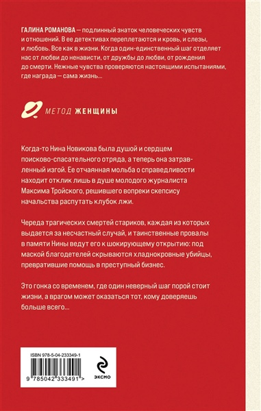 Когда-то Нина Новикова была душой и сердцем поисково-спасательного отряда, а теперь она затравленный изгой. Ее отчаянная мольба о справедливости находит отклик лишь в душе молодого журналиста Максима Тройского, решившего вопреки скепсису начальства распутать клубок лжи. Череда трагических смертей стариков, каждая из которых выдается за несчастный случай, и таинственные провалы в памяти Нины ведут его к шокирующему открытию: под маской благодетелей скрываются хладнокровные убийцы, превратившие помощь в преступный бизнес. Это гонка со временем, где один неверный шаг порой стоит жизни, а врагом может оказаться тот, кому доверяешь больше всего… Галина Романова — подлинный знаток человеческих чувств и отношений. В ее детективных мелодрамах из серии «Метод женщины» переплетаются и кровь, и слезы, и любовь. Все, как в реальности, когда один единственный шаг отделяет нас от любви до ненависти, от дружбы до любви, от рождения до смерти. Нежные чувства проверяются настоящими испытаниями, где награда — сама жизнь.