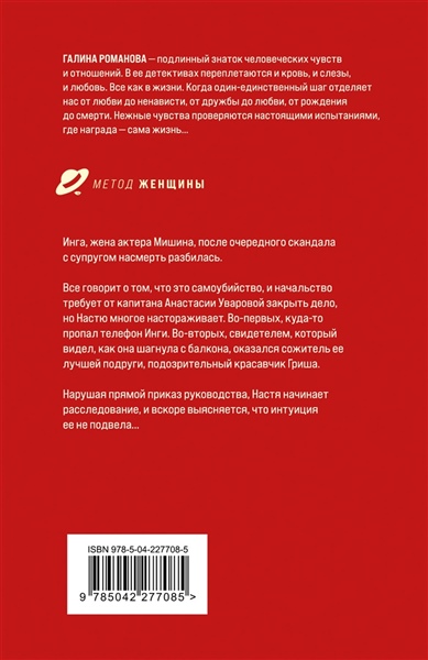 Инга, жена актера Мишина, после очередного скандала с супругом насмерть разбилась. Все говорит о том, что это самоубийство, и начальство требует от капитана Анастасии Уваровой закрыть дело, но Настю многое настораживает. Во-первых, куда-то пропал телефон Инги. Во-вторых, свидетелем, который видел, как она шагнула с балкона, оказался сожитель ее лучшей подруги, подозрительный красавчик Гриша. Нарушая прямой приказ руководства, Настя начинает копать, и вскоре выясняется, что интуиция ее не подвела… Галина Романова — подлинный знаток человеческих чувств и отношений. В ее детективных мелодрамах из серии «Метод женщины» переплетаются и кровь, и слезы, и любовь. Все, как в реальности, когда один-единственный шаг отделяет нас от любви до ненависти, от дружбы до любви, от рождения до смерти. Нежные чувства проверяются настоящими испытаниями, где награда — сама жизнь.
