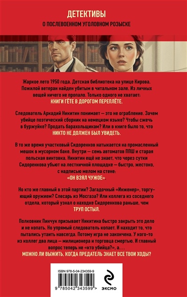 Послевоенный детектив о предательстве, оружии и тайне старой книги. Жаркое лето 1950 года. Детская библиотека на улице Кирова. Пожилой ветеран найден убитым в читальном зале. Из личных вещей ничего не пропало. Только одного не хватает: КНИГИ ГЁТЕ В ДОРОГОМ ПЕРЕПЛЁТЕ. Следователь Аркадий Никитин понимает — это не ограбление. Зачем убийце поэтический сборник на немецком языке? Чтобы сжечь в буржуйке? Продать барахольщикам? Или в книге было то, что НИКТО НЕ ДОЛЖЕН БЫЛ УВИДЕТЬ. В то же время участковый Сидоренков натыкается на промасленный мешок в мусорном баке. Внутри — семь автоматов ППШ и старая польская винтовка. Никитин еще не знает, что через сутки Сидоренкова убьют на лестничной площадке — быстро, жестоко, с надписью мелом на стене: «ОН ВЗЯЛ ЧУЖОЕ». Но кто же главный в этой партии? Загадочный «Инженер», торгующий оружием? Слесарь из Мосгаза? Или коллега из соседнего отдела, который узнал о находке Сидоренкова раньше, чем ТРУП ОСТЫЛ. Полковник Пинчук призывает Никитина быстро закрыть это дело и не копать. Но упрямый следователь копает. И находит то, что пытались утаить навсегда. Потому игра не закончена. У кого-то из коллег два лица — милиционера и торговца смертью. И главный вопрос теперь не «кто убийца?», а… МОЖНО ЛИ ВЫЖИТЬ, КОГДА ПРЕДАТЕЛЬ ЗНАЕТ ВСЕ ТВОИ ХОДЫ?