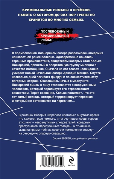 «В романах Валерия Шарапова настолько ощутимо время, что кажется, еще немного, и ты очутишься среди героев этих книг — невозмутимых следователей, коварных преступников, перепуганных граждан. А отчаянные сыщики примут тебя за своего и немедленно возьмут на очередную опасную операцию…» — Сергей ЗВЕРЕВ, автор боевых романов