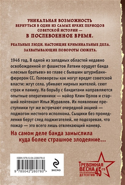 1946 год. В одной из западных областей недавно освобожденной от фашистов Латвии орудует банда «лесных братьев» во главе с бывшим штурмбаннфюрером СС. Головорезы как могут вредят советской власти: жгут села, убивают мирных жителей, сеют страх и панику. На борьбу с бандитами направляются опытные оперативники майор Клим Орлов и старший лейтенант Илья Журавлев. Их появление преступники тут же «встречают» очередной акцией — поджогом местного исполкома. Сыщики без промедления берут след поджигателей, не подозревая, что пожар — это всего лишь отвлекающий маневр. На самом деле банда замыслила куда более страшное злодеяние… Уникальная возможность вернуться в один из самых ярких периодов советской истории — в послевоенное время. Реальные люди, настоящие криминальные дела, захватывающие повороты сюжета. Персонажи, похожие на культовые образы фильма «Место встречи изменить нельзя». Дух времени, трепетно хранящийся во многих семьях. Необычно и реалистично показанная «кухня» повседневной работы советской милиции.