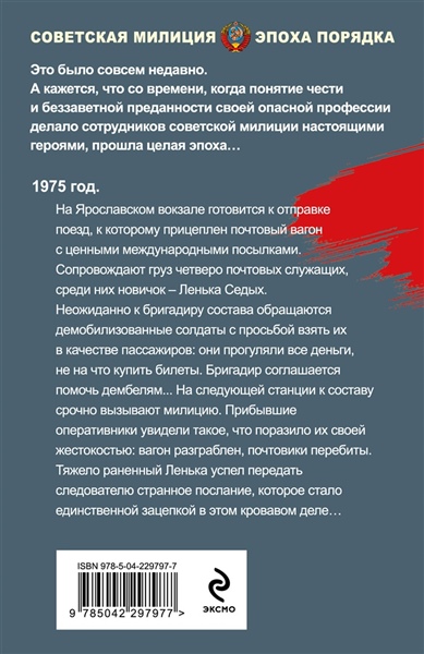 Романы о настоящих героях своей эпохи — сотрудниках советской милиции, людях, для которых служебный подвиг — обыденное дело. 1975 год. На Ярославском вокзале готовится к отправке поезд, к которому прицеплен почтовый вагон с ценными международными посылками. Сопровождают груз четверо почтовых служащих, среди них новичок — Ленька Седых. Неожиданно к бригадиру состава обращаются демобилизованные солдаты с просьбой взять их в качестве пассажиров: они прогуляли все деньги, не на что купить билеты. Бригадир соглашается помочь дембелям... На следующей станции к составу срочно вызывают милицию. Прибывшие оперативники увидели такое, что поразило их своей жестокостью: вагон разграблен, почтовики перебиты. Тяжело раненный Ленька успел передать следователю странное послание, которое стало единственной зацепкой в этом кровавом деле… Это было совсем недавно. Когда честь и беззаветная преданность опасной профессии были главными и обязательными качествами советских милиционеров…