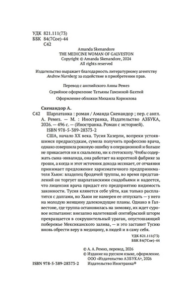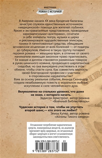 НЕЗАКОННОЕ ПОТРЕБЛЕНИЕ НАРКОТИЧЕСКИХ СРЕДСТВ, ПСИХОТРОПНЫХ ВЕЩЕСТВ, ИХ АНАЛОГОВ ПРИЧИНЯЕТ ВРЕД ЗДОРОВЬЮ, ИХ НЕЗАКОННЫЙ ОБОРОТ ЗАПРЕЩЕН И ВЛЕЧЕТ УСТАНОВЛЕННУЮ ЗАКОНОДАТЕЛЬСТВОМ ОТВЕТСТВЕННОСТЬ. США, начало XX века. Тусия Хазерли, вопреки устоявшимся предрассудкам, сумела получить профессию врача, однако совершила роковую ошибку в операционной и больше не прикасается ни к скальпелю, ни к стетоскопу. Чтобы содержать сына-инвалида, она работает на корсетной фабрике за гроши, а когда и этот источник дохода иссякает, от отчаяния принимает предложение харизматичного предпринимателя Хьюи: владелец бродячей труппы, во время представлений он торгует шарлатанскими снадобьями и надеется, что лицензия врача придаст его предприятию видимость законности. Тусия клянется себе уйти, как только расплатится с долгами, но Хьюи не намерен ее отпускать — у него на молодую женщину далекоидущие планы. Однако в Галвестоне, где труппа остановилась на зимовку, их ждет суровое испытание: внезапно налетевший сентябрьский шторм превращается в сокрушительный ураган, опустошающий побережье Мексиканского залива, — и это заставит Тусию вновь обрести веру в медицину, в людей и в саму себя.