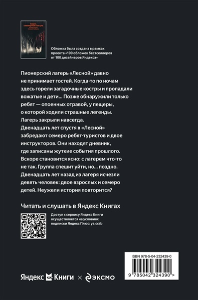 Пионерский лагерь «Лесной» давно не принимает гостей. Когда-то здесь произошли странные вещи: сначала обнаружили распятую чайку, затем по ночам в лесу начали замечать загадочные костры, и, наконец, куда-то стали пропадать вожатые и дети… Обнаружить удалось только ребят — опоенных отравой, у пещеры, о которой ходили страшные легенды. Лагерь закрыли навсегда. Двенадцать лет спустя в «Лесной» забредает отряд туристов: семеро ребят и двое инструкторов. Они находят дневник, где записаны жуткие события прошлого. Сначала эти истории кажутся детскими страшилками, но вскоре становится ясно: с лагерем что-то не так. Группа решает поскорее уйти, но… поздно. 12 лет назад из лагеря исчезли девять человек: двое взрослых и семеро детей. Неужели история повторится вновь? «Будоражащий воображение триллер, балансирующий на грани между мистикой и реальностью. Душевная история о дружбе, любви и силе духа, которые появляются в детстве и остаются с нами на долгие годы. Эта мрачная сказка затянет вас с головой и не отпустит до последней страницы...» — Лада Кутузова, писатель-сценарист, финалист Национальной премии в области детской и подростковой литературы, автор более 20 книг «100 из 100. Дизайнерская серия» — это коллаборация между «ЭКСМО» и Яндекс.Книги, в рамках которой дизайнеры предлагают свое уникальное видение литературных произведений. Многогранность российской и зарубежной современной прозы подчеркивается разнообразием художественных приемов в оформлении. Удобный формат. Мягкий переплет. Кремовая бумага.