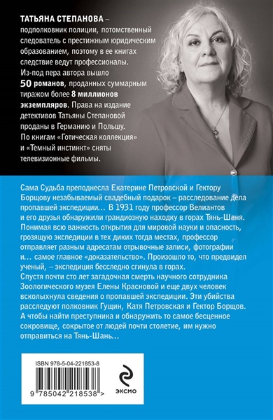 Сама Судьба преподнесла Екатерине Петровской и Гектору Борщову незабываемый свадебный подарок — расследование дела Пропавшей экспедиции… В 1931 году профессор Велиантов и его друзья обнаружили грандиозную находку в горах Тянь-Шаня. Понимая всю важность открытия для мировой науки и опасность, грозящую экспедиции в тех диких тогда местах, профессор отправляет разным адресатам отрывочные записи, фотографии и… самое главное «доказательство». Произошло то, что предвидел ученый — экспедиция бесследно сгинула в горах. Спустя почти сто лет загадочная смерть научного сотрудника Зоологического музея Елены Красновой и еще двух человек всколыхнули сведения о Пропавшей экспедиции. Эти убийства расследует полковник Гущин, Катя Петровская и Гектор Борщов. А чтобы найти преступника и обнаружить то самое бесценное сокровище, сокрытое от людей почти столетие, им нужно отправиться на Тянь-Шань… Татьяна Степанова — подполковник полиции, бывший сотрудник Пресс-центра ГУВД Московской области и следователь, поэтому в ее остросюжетных романах так правдоподобно и детально описывается расследование криминальных загадок. Татьяна ежедневно работает с информацией о реальных преступлениях, и ее детективные истории максимально достоверны.