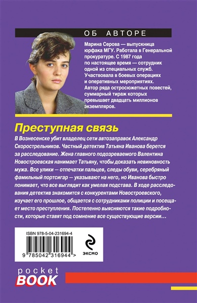 В Вознесенске убит владелец сети автозаправок Александр Скорострельников. Частный детектив Татьяна Иванова берется за расследование. Жена главного подозреваемого Валентина Новостроевская нанимает Татьяну, чтобы доказать невиновность мужа. Все улики — отпечатки пальцев, следы обуви, серебряный фамильный портсигар — указывают на него, но Иванова быстро понимает, что все выглядит как умелая подстава. В ходе расследования детектив знакомится с конкурентами Новостроевского, изучает его прошлое, общается с сотрудниками полиции и посещает место преступления. Постепенно выясняются такие подробности, которые ставят под сомнение все существующие версии... Марина Серова — феномен современного отечественного детективного жанра. Выпускница юрфака МГУ, работала в Генеральной прокуратуре. Участвовала в оперативных мероприятиях. Автор ряда остросюжетных повестей, суммарный тираж которых превышает двадцать миллионов экземпляров.