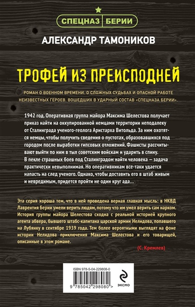 Роман о военном времени, о сложных судьбах и опасной работе неизвестных героев, вошедших в ударный состав «спецназа Берии». 1942 год. Оперативная группа майора Максима Шелестова получает приказ найти на оккупированной немцами территории неподалеку от Сталинграда ученого-геолога Аристарха Витольда. За ним охотятся немцы, чтобы получить сведения о пустотах, образовавшихся под городом после выработки гипсовых отложений. Фашисты рассчитывают выйти по ним в тыл советским войскам и ударить в спину. В пекле страшных боев под Сталинградом найти человека — задача практически невыполнимая. Но оперативникам все-таки удается напасть на след ученого. Однако, чтобы доставить его в штаб живым и невредимым, придется пройти не один круг ада… «Эта серия хороша тем, что в ней проведена верная главная мысль: в НКВД Лаврентия Берии умели верить людям, потому что им умел верить сам нарком. История группы майора Шелестова сходна с реальной историей крупного агента абвера, бывшего штабс-капитана царской армии Нелидова, попавшего на Лубянку в сентябре 1939 года. Тем более вероятными выглядят на фоне истории Нелидова приключения Максима Шелестова и его товарищей, описанные в этом романе». — С. Кремлев Общий тираж книг А. Тамоникова — более 10 миллионов экземпляров.