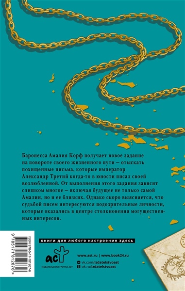 Баронесса Амалия Корф получает новое задание на повороте своего жизненного пути - отыскать похищенные письма, которые император Александр Третий когда-то в юности писал своей возлюбленной. От выполнения этого задания зависит слишком многое - включая будущее не только самой Амалии, но и ее близких. Однако вскоре выясняется, что не только баронесса интересуется судьбой писем, которые оказались в центре столкновения могущественных интересов...