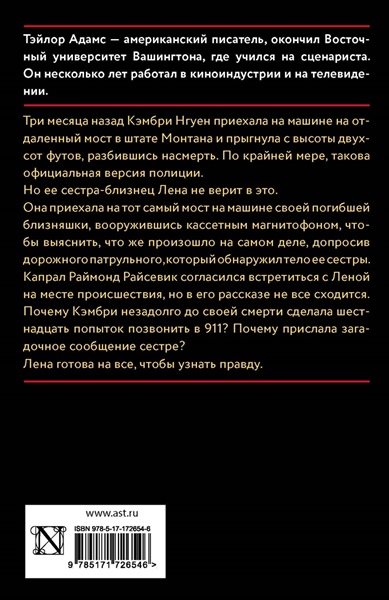 Три месяца назад Кэмбри Нгуен приехала на машине на отдаленный мост в штате Монтана и прыгнула с высоты двухсот футов, разбившись насмерть. По крайней мере, такова официальная версия полиции. Но ее сестра-близнец Лена не верит в это. Она приехала на тот самый мост на машине своей погибшей близняшки, вооружившись кассетным магнитофоном, чтобы выяснить, что же произошло на самом деле, допросив дорожного патрульного, который обнаружил тело ее сестры. Капрал Раймонд Райсевик согласился встретиться с Леной на месте происшествия, но в его рассказе не все сходится. Почему Кэмбри незадолго до своей смерти сделала шестнадцать попыток позвонить в 911? Почему прислала загадочное сообщение сестре? Лена готова на все, чтобы узнать правду.