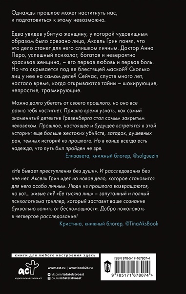 Едва увидев убитую женщину, у которой чудовищным образом было срезано лицо, Аксель Грин понял, что это дело станет для него слишком личным. Доктор Анна Перо – успешный психолог, богатая и невероятно красивая женщина – его первая любовь и первая боль. Но что скрывается под ее блестящей маской? Сколько лиц у нее на самом деле? Сейчас, спустя много лет, настало время, когда открываются тайны – шокирующие, непростые, травмирующие.