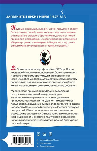БЕССТРАШНАЯ СЫЩИЦА ДЖЕЙН ОСТЕН РАССЛЕДУЕТ СЕМЕЙНЫЕ ТАЙНЫ. ДЛЯ ПОКЛОННИКОВ ПИТЕРА БОЛАНДА, КРИСТЕН ПЕРРИН, ДЖЕНИС ХАЛЛЕТТ И РИЧАРДА ОСМАНА. Неугомонной сыщице Джейн Остен предстоит спасти благополучие своей семьи, когда наследство старшего брата грозится перейти к принцессе-самозванке. Сумеет ли юная писательница уберечь родных от неминуемой бедности, когда даже самый близкий человек хранит темные секреты? Добро пожаловать в графство Кент, 1797 год. После неудавшейся помолвки юная Джейн Остен приезжает к своему старшему брату Нэдди. Его беременная жена Элизабет мечтает выдать девушку замуж, поэтому подыскивает для нее выгодную партию на всех балах Кента. Но от этой идеи ее отвлекает ужасное событие. Миссис Найт, приемная мать Нэдди, владеющая роскошным поместьем Годмершем-парк и многочисленными угодьями, попала под влияние принцессы-самозванки, найденной на берегу моря после кораблекрушения. Джейн опасается, что из-за нее наследство Нэдди и все благополучие Остенов окажутся под угрозой. Юная писательница полна решимости разоблачить самозванку. Однако затем дело принимает мрачный оборот, и внезапно под угрозой оказывается не только наследство. Оказывается, родной брат хранит опасный секрет… _________________________________________________________ «Джейн — очаровательно неуклюжий детектив, в равной степени умный и импульсивный. В расследовании много напряженных моментов, которых часто не хватает в подобных легких исторических романах». — Publishers Weekly «Точные детали эпохи регентства, сложные взаимоотношения в большой семье Остен и социальный контекст, основанный на ожиданиях общества относительно порядка рождения, пола и экономического статуса, являются основой для глубокого исследования автора, но еще больше впечатляет то, как быстро эти живые и привлекательные персонажи становятся новыми вымышленными друзьями. Поклонники жанра будут в восторге от вдумчивого изображения Джейн, а поклонники исторической прозы и детективов найдут много интересного». — Booklist «Редко встретишь книгу, которая с каждой страницей вызывает новый восторг, но именно так обстоит дело с "Роковой удачей". Читатель погружается в мир Джейн Остен, и какой же этот мир увлекательный. Прекрасно пишущая, проницательная и обладающая великолепным остроумием, Джессика Булл раскрывает запутанную и интригующую тайну, которая восхитительно напоминает остенскую». — Ванесса Келли, автор бестселлеров в жанрах исторического детектива и исторического любовного романа