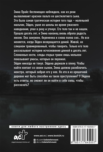 Эмма Прайс беспомощно наблюдала, как из реки вылавливают красное пальто ее шестилетнего сына. Это была самая трагическая история того года – маленький мальчик, Эйден, ушел из школы во время ужасного наводнения, упал в реку и утонул. Его тело так и не нашли. Прошло десять лет, и Эмма наконец вновь обрела радость жизни. Она замужем, беременна и снова полна сил… Но все меняется, когда Эйден возвращается домой. Живой, но слишком травмированный, чтобы говорить. Только его тело рассказывает историю исчезновения длиной в десять лет. Сломанные кости, следы старых травм лишь мельком показывают ужасы, которые он пережил. Эйден никогда не тонул. Эйдена держали в плену. Чтобы найти контакт со своим сыном, Эмма должна разоблачить монстра, который забрал его у нее. Но кто в их крошечной деревне мог быть способен на такое преступление? У Эйдена есть ответы, но сможет ли он найти в себе силы, чтобы рассказать?