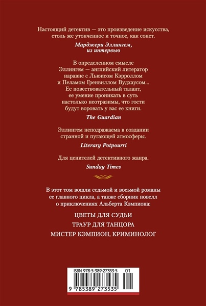 Марджери Луиза Эллингем — английская писательница, принадлежащая «золотому веку английской литературы», признанная «королева детектива» наряду с Агатой Кристи, Дороти Сэйерс и Найо Марш. Она выделялась на фоне других авторов этого жанра, по выражению Агаты Кристи, «как горящая лампа». Наибольшую известность приобрели книги Эллингем о сыщике-джентльмене Альберте Кэмпионе. В этот том вошли седьмой и восьмой романы ее главного цикла, а также сборник новелл «Мистер Кэмпион, криминолог». Забота о репутации фирмы всегда стояла у Джона Уиддоусона на первом месте. И двадцать лет назад, и сейчас, когда под ударом не только репутация, но и свобода его двоюродного брата. Мистер Уиддоусон предпочел блюсти честь возглавляемого им издательского дома. А вот мистер Альберт Кэмпион предпочел докопаться до сути этой трагедии, и не только потому, что брат издателя — его давний друг, которого хочется вызволить из беды. Дальний родственник Кэмпиона, на старости лет создавший музыкальное шоу, просит сыщика выяснить, кто чинит неприятности ведущему актеру. Кэмпион погружается в мир театральных страстей и интриг, где придется расследовать дела посерьезнее, чем испорченная афиша или булавка в гримировальном карандаше. Кэмпион получает анонимное письмо с упоминанием ангела, Питерса и крота. В то же утро газета «Таймс» печатает сообщение о смерти Р. И. Питерса. Судя по всему, покойник не кто иной, как бывший одноклассник по прозвищу Свин, которого Кэмпион ненавидел в школе и о котором больше двадцати лет не было вестей. На похоронах Свина Кэмпион встречает еще одного соученика, который получил точно такое же письмо, и беседует с врачом Питерса, утверждающим, что тот скончался от пневмонии. Невероятно, но, стоя перед гробом, Кэмпион слышит у себя за спиной очень знакомый кашель. Именно так когда-то кашлял подлый Свин…
