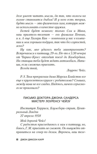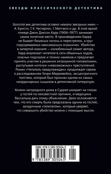 Золотой век детектива оставил немало звездных имен — А. Кристи, Г. К. Честертон, Г. Митчелл и др. В этой яркой плеяде Джон Диксон Карр (1906–1977) занимает самое почетное место. В произведениях Карра не бывает бешеных погонь и перестрелок, а круг подозреваемых максимально ограничен. Убийство в запертой комнате — излюбленный сюжет автора. Карр вовлекает читателя в сети обманных ходов, ложных подсказок и тонких намеков и предлагает принять участие в решении хитроумной головоломки, распутывая ниточки «невозможных» преступлений.