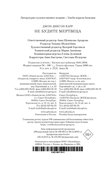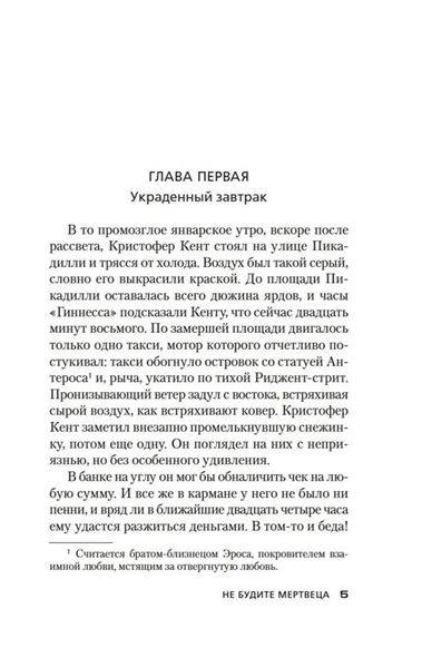 Промозглым лондонским утром герой романа «Не будите мертвеца» (1938) Кристофер Кент оказался перед дверью отеля «Королевский багрянец» без гроша в кармане. Он уже и сам был не рад, что ввязался в это дурацкое пари, но, чтобы его выиграть, оставалось продержаться всего сутки. Остроумное решение, где раздобыть завтрак, явилось буквально с неба, и кто мог бы предположить, что спустя какой-то час из-за этой безобидной авантюры он окажется подозреваемым в убийстве незнакомой дамы? Лишь Гидеон Фелл, возможно, смог бы ему помочь...