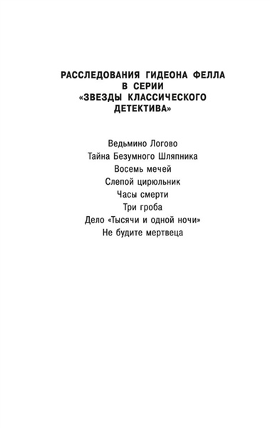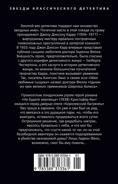 Золотой век детектива подарил нам множество звездных имен. Почетное место в этой плеяде по праву принадлежит Джону Диксону Карру (1906–1977) — виртуозному мастеру идеально построенных «невозможных преступлений в запертой комнате». В 1933 году Джон Диксон Карр впервые представил публике сыщика-любителя, эксцентричного доктора Гидеона Фелла, которого английский писатель Кингсли Эмис в своем эссе «Мои любимые сыщики» назвал «одним из трех великих преемников Шерлока Холмса».