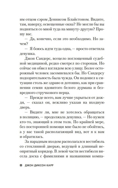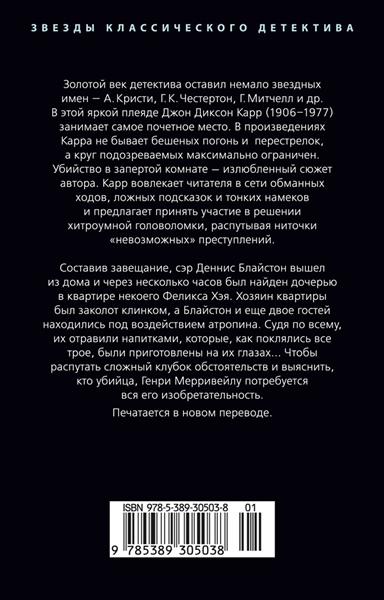 Золотой век детектива оставил немало звездных имен — А. Кристи, Г. К. Честертон, Г. Митчелл и др. В этой яркой плеяде Джон Диксон Карр (1906–1977) занимает самое почетное место. В произведениях Карра не бывает бешеных погонь и  перестрелок, а круг подозреваемых максимально ограничен. Убийство в запертой комнате — излюбленный сюжет автора. Карр вовлекает читателя в сети обманных ходов, ложных подсказок и тонких намеков и предлагает принять участие в решении хитроумной головоломки, распутывая ниточки «невозможных» преступлений. Составив завещание, сэр Деннис Блайстон вышел из дома и через несколько часов был найден дочерью в квартире некоего Феликса Хэя. Хозяин квартиры был заколот клинком, а Блайстон и еще двое гостей находились под воздействием атропина. Судя по всему, их отравили напитками, которые, как поклялись все трое, были приготовлены на их глазах. Чтобы распутать сложный клубок обстоятельств и выяснить, кто убийца, Генри Мерривейлу потребуется вся его изобретательность. Печатается в новом переводе.