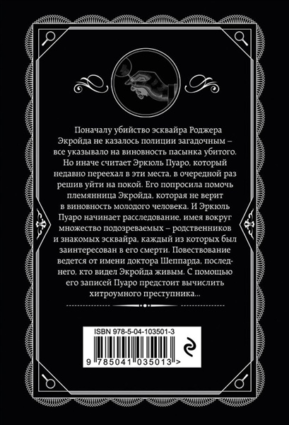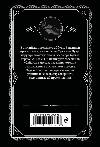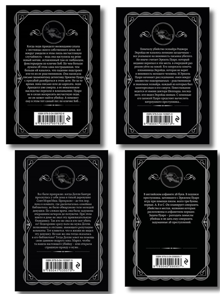 Убийства по алфавиту В английском алфавите 26 букв. В подписи преступника, затеявшего с Эркюлем Пуаро игру при помощи писем, всего три буквы, первые, А, B и С. Он планирует совершить убийства в местах, названия которых расположены в алфавитном порядке. Задача Пуаро - разгадать замыслы убийцы и не дать ему совершить задуманные 26 преступлений. Немой свидетель. Когда леди Аранделл неожиданно упала с лестницы своего собственного дома, все вокруг увидели в этом лишь несчастливую случайность – ведь она наступила на резиновый мячик, оставленный там ее любимцем, фокстерьером по кличке Боб. Но чем больше думала об этом сама пострадавшая, тем больше ей казалось, что падение подстроил кто-то из ее родственников. Она написала письмо знаменитому детективу Эркюлю Пуаро с просьбой разобраться в этом деле. Но за то время, пока письмо шло до адресата, леди Аранделл уже умерла, а ее немаленькое наследство перешло к компаньонке. Пуаро не в силах воскресить несчастную леди, но он может найти убийцу. А поможет ему в этом тот самый пес по кличке Боб… Труп в библиотеке Все было прекрасно, когда Долли Бантри проснулась у себя дома в тихой деревушке Сент-Мэри-Мид. Прекрасно – до тех пор, пока в комнате, где располагалась семейная библиотека, не было обнаружено тело молодой девушки. По словам врача, она была задушена вчерашним вечером до полуночи. При этом никто в доме не знал эту привлекательную блондинку. Так кто же она, и кто мог убить ее? Подозрение сразу пало на мужа Долли, полковника в отставке, имеющего репутацию волокиты. Тот клянется, что в жизни не видел эту девушку. Но как же она тогда оказалась в его библиотеке? Тогда Долли зовет на помощь свою давнюю подругу мисс Марпл, чтобы та нашла настоящего убийцу – или открыла страшную правду о муже… Убийство Роджера Экройда Поначалу убийство эсквайра Роджера Экройда не казалось полиции загадочным - все указывало на виновность пасынка убитого. Но иначе считает Эркюль Пуаро, который недавно переехал в эти места, в очередной раз решив уйти на покой. Его попросила помочь племянница Экройда, которая не верит в виновность молодого человека. И Эркюль Пуаро начинает расследование, имея вокруг множество подозреваемых - родственников и знакомых эсквайра, каждый из которых был заинтересован в его смерти. Повествование ведется от имени доктора Шеппарда, последнего, кто видел Экройда живым. С помощью его записей Пуаро предстоит вычислить хитроумного преступника...