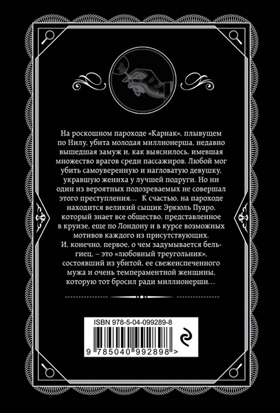 Этот роман является прямым продолжением «Убийства в “Восточном экспрессе”» — и практически ничем не уступает «детективу всех времен и народов». Агата Кристи — самый публикуемый автор всех времен и народов после Шекспира. Тиражи ее книг уступают только тиражам его произведений и Библии. В мире продано больше миллиарда книг Кристи на английском языке и столько же — на других языках. Она автор восьмидесяти детективных романов и сборников рассказов, двадцати пьес, двух книг воспоминаний и шести психологических романов, написанных под псевдонимом Мэри Уэстмакотт. Ее персонажи Эркюль Пуаро и мисс Марпл навсегда стали образцовыми героями остросюжетного жанра. На роскошном пароходе «Карнак», плывущем по Нилу, убита молодая миллионерша, недавно вышедшая замуж и, как выяснилось, имевшая множество врагов среди пассажиров. Любой мог убить самоуверенную и нагловатую девушку, укравшую жениха у лучшей подруги. Но ни один из вероятных подозреваемых не совершал этого преступления… К счастью, на пароходе находится великий сыщик Эркюль Пуаро, который знает все общество, представленное в круизе, еще по Лондону и в курсе возможных мотивов каждого из присутствующих. И, конечно, первое, о чем задумывается бельгиец — это о «любовном треугольнике», состоявшем из убитой, ее свежеиспеченного мужа и очень темпераментной женщины, которую тот бросил ради миллионерши… -------------------------------------------------- «Несомненно, она гений». — Элизабет Джордж, автор бестселлеров New York Times «Общепринято считать Кристи блестящим мастером острого сюжета. Однако она представляет собой нечто гораздо более значительное». — The Guardian «Если речь о драме с убийством — здесь нет никого изобретательней Кристи». — Sunday Times «…Я до сих пор обожаю романы Кристи». — Луиза Пенни «Читать роман Кристи — словно вгрызаться в спелое яблоко: чистейшее, хрустящее и абсолютное удовлетворение…» — Тана Френч «Безупречный сюжет». — Daily Mail «Нужно сразу читать дважды: первый раз наслаждаться, второй — следить за хитросплетениями». — The Times «Одно из лучших дел Пуаро». — Sunday Times