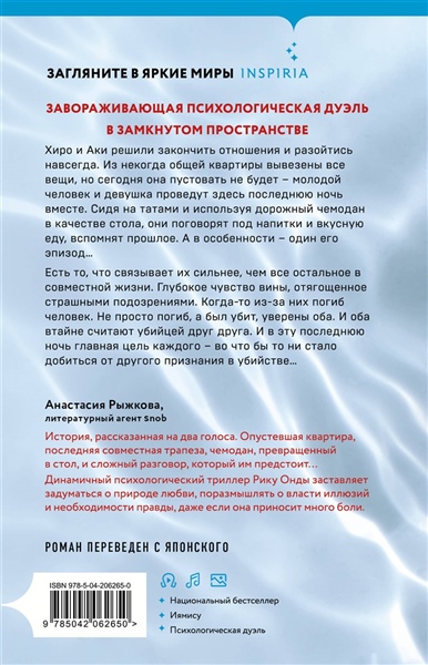 Герметичный триллер от лауреата остросюжетной премии № 1 в Японии — «Японской детективной литературы». Завораживающая психологическая дуэль в замкнутом пространстве.