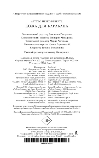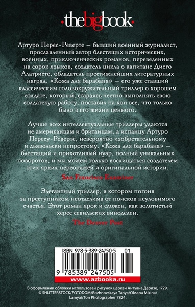 Неизвестный хакер проникает в личный компьютер папы римского и оставляет сообщение о севильской церкви, которая «убивает, чтобы себя защитить». Секретная служба Ватикана отряжает в Севилью Лоренцо Куарта, эмиссара Института внешних дел, и в поисках таинственного хакера тот погружается в хитросплетения церковной политики, большого бизнеса и коррупции: детективное расследование затягивает его, плотские соблазны манят и опасность грозит не только его жизни, но и его вере и обетам… Артуро Перес-Реверте — бывший военный журналист, прославленный автор блестящих исторических, военных, приключенческих романов, переведенных на сорок языков, создатель цикла о капитане Диего Алатристе, обладатель престижнейших литературных наград. «Кожа для барабана» — его уже ставший классическим головокружительный триллер о хорошем солдате, который, стараясь честно выполнять свою солдатскую работу, поставил на кон все, что только было в его жизни ценного.