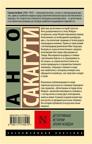 Действие детективных историй Сакагути Анго разворачивается в эпоху Мэйдзи — во времена, когда Япония переживала период болезненной, но необходимой трансформации, а тысячелетние традиции уступали дорогу новомодным веяниям. Одним из таких веяний стал благородный джентльмен Юки Синдзюро. Выходец из семьи потомственных самураев, получивший блестящее образование на западе, Юки вернулся на родину со стойким стремлением бороться за справедливость. Не гоняясь за славой или богатством и не желая превращаться в правительственного чиновника, Синдзюро становится сыщиком-любителем, к которому полиция сама обращается всякий раз, как следствие заходит в тупик. Изначально публиковавшиеся в виде отдельных рассказов на страницах периодических журналов, "Детективные истории эпохи Мэйдзи" завоевали популярность публики и с тех пор легли в основу двух телесериалов, манги и аниме. В данное издание вошли первые десять из двадцати рассказов сборника. Все истории публикуются на русском языке впервые.