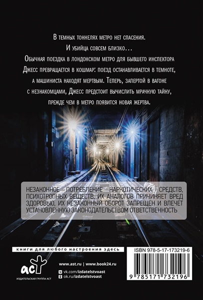 В темных тоннелях метро нет спасения. И убийца совсем близко… Обычная поездка в лондонском метро для бывшего инспектора Джесс превращается в кошмар: поезд останавливается в темноте, а машиниста находят мертвым. Теперь, запертой в вагоне с незнакомцами, Джесс предстоит вычислить мрачную тайну, прежде чем в метро появится новая жертва.