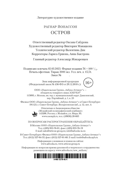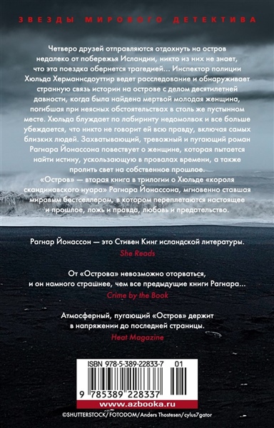 Четверо друзей отправляются отдохнуть на остров недалеко от побережья Исландии, никто из них не знает, что эта поездка обернется трагедией... Инспектор полиции Хюльда Херманнсдоуттир ведет расследование и обнаруживает странную связь истории на острове с делом десятилетней давности, когда была найдена мертвой молодая женщина, погибшая при неясных обстоятельствах в столь же пустынном месте. Хюльда блуждает по лабиринту недомолвок и все больше убеждается, что никто не говорит ей всю правду, включая самых близких людей. Захватывающий, тревожный и пугающий роман Рагнара Йонассона повествует о женщине, которая пытается найти истину, ускользающую в провалах времени, а также пролить свет на собственное прошлое. «Остров» — вторая книга в трилогии о Хюльде «короля скандинавского нуара» Рагнара Йонассона, мгновенно ставшая мировым бестселлером, в котором переплетаются настоящее и прошлое, ложь и правда, любовь и предательство.