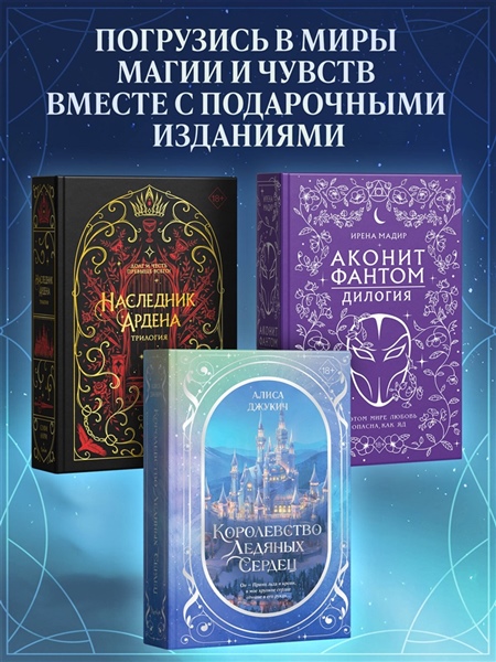 Перед вами коллекционное издание дилогии «Королевство ледяных сердец» Алисы Джукич в одном томе — настоящий подарок для ценителей серии и поклонников «Жестокого принца»! Теперь вся история Агнес Эркенст — бессмертной девушки, разрывающейся между миром людей и тайнами фейри — собрана под одной обложкой.