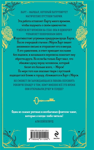 Харт — маршал, который патрулирует магические пустоши Танрии. Эта работа оставляет Харту много времени, чтобы подумать о своём одиночестве. У Мёрси нет времени на себя: она в одиночку управляет похоронным бюро и противостоит угрюмым придуркам вроде Харта. После очередной стычки с Мёрси Харт пишет анонимное письмо и отправляет его в никуда. К его удивлению, в ответ приходит послание без подписи, и начавшаяся переписка помогает ему обрести друга. Но если бы только Харт знал, что обнажил душу перед человеком, который бесит его больше всего, — Мёрси! По мере того как опасные твари с пустошей подходят всё ближе к городу, сближаются и Харт с Мёрси. Но сможет ли зарождающаяся любовь пережить роковую правду о том, кому именно всё это время они открывали душу и сердце? Международный бестселлер и хит Буктока! Для поклонников Ребекки Росс, Дианы Уинн Джонс и Ханны Николь Мерер. Cozy фэнтези, в котором совмещены все любимые тропы: от ненависти до любви, похоронное бюро и приключения. Трендовое оформление от популярных художников ALES, MARKASS и Pychxta!