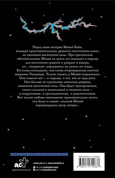 Перед нами история Микай Бэйн, молодой представительницы древнего магического клана, не имеющей магической силы. При трагических обстоятельствах, Микай на шесть лет попадает в тюрьму для магических существ и умирает в камере, но… воскресает, вернувшись на десять лет назад. Ей снова семнадцать, она снова второкурсница элитной академии Уэнсридж. Только память у Микай сохранилась. Она помнит все — и тюрьму, и тех, кто ее туда упек. Она больше не глупенькая, невинная девушка, лишенная магической силы. Она будет тренироваться, станет сильной и выносливой и отомстит всем — и сокурсникам, и преподавателям, и родственникам. Вот только любовь оказывается привлекательнее мести, тем более к новой сильной Микай неравнодушны сразу пятеро…