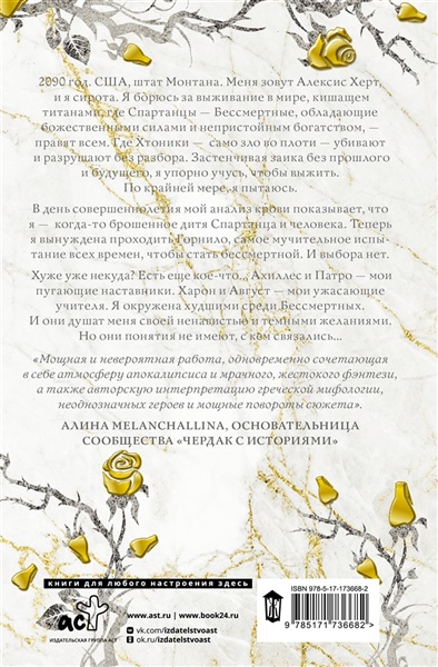 2090 год. США, штат Монтана. Меня зовут Алексис Херт и я сирота. Я борюсь за выживание в мире, кишащем титанами, где Спартанцы — бессмертные, обладающие божественными силами и непристойным богатством, правят всем. Где Хтоники — само зло во плоти, убивают и разрушают без разбора. Застенчивая заика без прошлого и будущего, я упорно учусь, чтобы выжить. По крайней мере, я пытаюсь. В день совершеннолетия мой анализ крови показывает, что я — когда-то брошенное дитя Спартанца и человека. Теперь я вынуждена проходить Горнило, самое мучительное испытание всех времен, чтобы стать бессмертной. И выбора нет. Хуже уже некуда? Есть еще кое-что... Ахиллес и Патро — мои пугающие наставники. Харон, и Август — мои ужасающие учителя. Я окружена худшими среди Бессмертных. И они душат меня своей ненавистью и темными желаниями. Но они понятия не имеют, с кем связались…