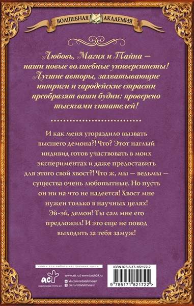 И как меня угораздило вызвать высшего демона?! Что? Этот наглый индивид готов участвовать в моих экспериментах и даже предоставить для этого свой хвост?! Что ж, мы – ведьмы – существа очень любопытные. Но пусть он ни на что не надеется! Хвост мне нужен только в научных целях! Эй-эй, демон! Ты сам мне его предложил! И это еще не повод выходить за тебя замуж!