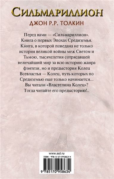 Перед вами Сильмариллион.Сильмариллион один из масштабнейших миров в истории фэнтези, мифологический канон, который Джон Руэл Толкин составлял на протяжении всей жизни. Книга о первых Эпохах Средиземья, в которой поведана не только история великой войны меж Светом и Тьмою, тысячелетия сотрясавшей некогда мирную и цветущую землю, но и предыстория Колец Всевластья. Колец, путь которых по Средиземью еще только начинается.Вы читали Властелина Колец? Тогда читайте его предысторию!..