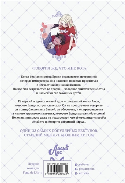 Ее первый и единственный друг — говорящий котик Амон, которого Бриди встретила в саду. Хотя у Амона просто невероятное самомнение для маленького пушистого зверька, он идеальный товарищ, о котором Бриди всегда мечтала. Впрочем, у Амона есть причины гордиться собой. Мало того, что он очаровательный котик, — он принц Священных Зверей, он оборотень, и он превращается в самого красивого мальчика, которого Бриди когда-либо видела!