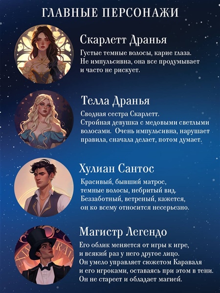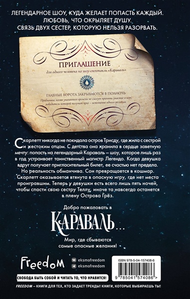 Легендарное шоу, куда желает попасть каждый.Любовь, что окрыляет душу.Связь двух сестер, которую нельзя разорвать.Скарлетт никогда не покидала остров Трисду, где жила с сестрой и жестоким отцом. С детских лет она хранила в сердце заветную мечту: попасть на легендарный Караваль – шоу, которое лишь раз в год устраивает таинственный магистр Легендо. Когда девушка вдруг получает пригласительный билет, ее счастью нет предела.Но реальность обманчива. Сон превращается в кошмар.Скарлетт оказывается втянута в опасную игру, где нет места проигравшим. Теперь у девушки есть всего лишь пять ночей, чтобы спасти свою сестру Теллу, иначе та навсегда останется в плену Острова Грёз.Добро пожаловать в Караваль... Мир, где сбываются самые опасные желания!