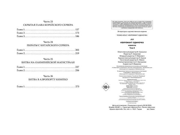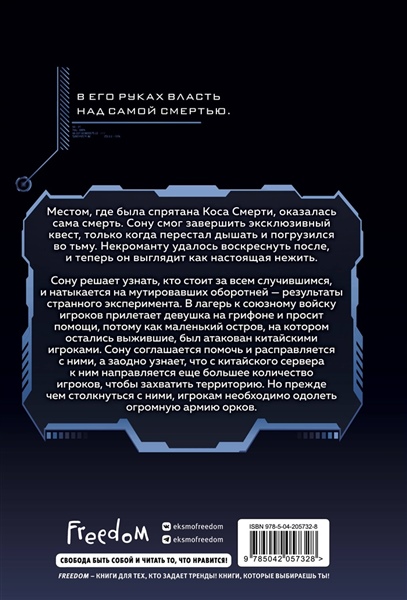 Четвертый том популярной новеллы «Некромант-одиночка» в жанре сёнэн с элементами RPG! В России ее прочитали более 4,3 млн человек. Местом, где была спрятана Коса Смерти, оказалась сама смерть. Сону смог завершить эксклюзивный квест, только когда перестал дышать и погрузился во тьму. Некроманту удалось воскреснуть после, и теперь он выглядит как настоящая нежить. Сону решает узнать, кто стоит за всем случившимся, и натыкается на мутировавших оборотней — результаты странного эксперимента. В лагерь к союзному войску игроков прилетает девушка на Грифоне и просит помощи, потому как маленький остров, на котором остались выжившие, был атакован китайскими игроками. Сону соглашается помочь и расправляется с ними, а заодно узнает, что с китайского сервера к ним направляется еще большее количество игроков, чтобы захватить территорию. Но прежде чем столкнуться с ними, игрокам необходимо одолеть огромную армию орков. По новелле есть красочная одноименная манхва. На корейской платформе Kakaopage у новеллы более 2,1 млн просмотров. На южнокорейской платформе Webtoons у манхвы более 48 млн поклонников. Для фанатов боевого фэнтези, новеллы «Наномашина» и манхвы «Поднятие уровня в одиночку». Иллюстрацию на обложку рисовала Kliory Draw.