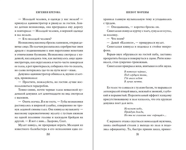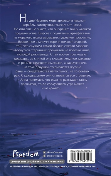Мрачное и пугающее славянское фэнтези от Евгении Кретовой! Смесь хоррора и фэнтези, в которой появляются призраки! В книге вас ждут: слоуберн, первые чувства, древнее проклятие, призраки, и любовь, способная сотворить чудо! На дне Черного моря археологи находят корабль, затонувший тысячу лет назад. Но они еще не знают, что он хранит тайну давнего предательства. Вместе с поднятыми артефактами из морского плена вырывается древнее проклятие, брошенное в минуту горечи волхвой Марьей, той, что служила самой богине смерти Морене. Коснуться старинных предметов не повезло Анне, молодой рок-певице. С тех пор ее преследуют кошмары, за спиной она слышит ледяное дыхание и речь на неизвестном языке, а каждую ночь на теле девушки открываются жуткие раны — свидетельства не то пыток, не то боевых ран. С каждым днем они становятся все страшнее, и Анна понимает, что если не разгадает тайну проклятия, то до следующего утра может и не дожить… Для поклонников романов Татьяны Мастрюковой и Влада Райбера!