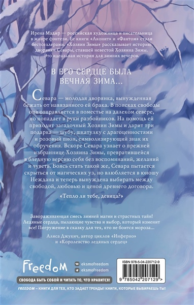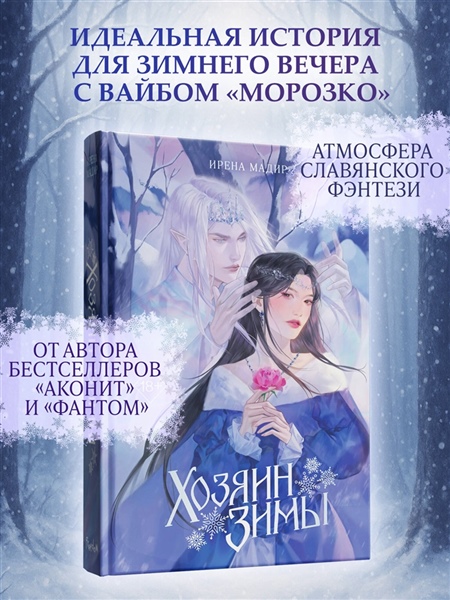 Новинка от Ирены Мадир, автора бестселлеров «Аконит» и «Фантом»! Идеальная история для зимнего вечера с вайбом «Морозко»! Для поклонников Кэтрин Арден и Наоми Новик! Молодая дворянка Севара бежит от навязанного брака, но волей судьбы становится невестой Хозяина Зимы — бессмертного существа, о котором ходят легенды. Пытаясь разорвать узы, девушка влюбляется в другого, и теперь перед ней стоит тяжелый выбор между свободой, любовью и ценой древнего договора.