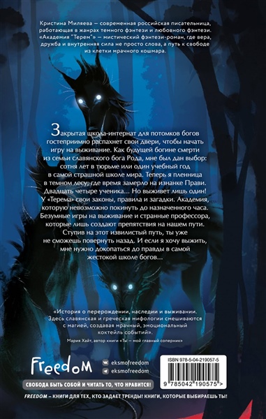 «Игра в кальмара» и «Закрытая школа» под одной обложкой! Мрачное и атмосферное одиночное темное фэнтези с элементами хоррора, дарк академии и выживания понравится всем поклонникам сериала «Уэнсдей» и романа «Исповедь демонолога». Закрытая школа-интернат для потомков богов гостеприимно распахнёт свои двери, чтобы начать игру на выживание. Как будущей богине смерти из семьи славянского бога Рода, мне был дан выбор: сотня лет в тюрьме или один учебный год в самой страшной школе мира. Теперь я пленница в тёмном лесу, где время замерло на изнанке Прави. Двадцать четыре ученика… Но выживет лишь один! У «Терема» свои законы, правила и загадки. Академия, которую невозможно покинуть до назначенного часа. Безумные игры на выживание и странные профессора, которые лишь создают препятствия на нашем пути. Ступив на этот извилистый путь, ты уже не сможешь повернуть назад. И если я хочу выжить, мне нужно докопаться до правды в самой жестокой школе богов…