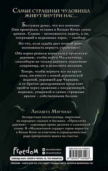 C возвращением в мрачную и полную мистики деревню Козьи Кочи! История, вдохновленная мифами Урала и сказами Бажова, напомнит вам популярный сериал «Топи» и книгу «Мрачный взвод». Атмосферное и захватывающее темное фэнтези со славянским колоритом. Бестужев думал, что все кончено. Они проиграли, оставив в Козьих Кочах самое ценное. Славик — возможность ходить, а он, погрязший в ведьминых чарах, — свободу. Но что, если судьба дает второй шанс, возможность вернуть утраченное? Оба парня решили вернуться в проклятую деревню, чтобы найти Малахитницу, способную не только даровать подземные сокровища, но и исполнять желания. Теперь, чтобы вернуть все на круги своя, им вместе с новой деревенской ведьмой, укравшей дар Чернавы, и ее братом двоедушником предстоит пройти через сражения с полуденницей, водяным, упырихой и самым страшным врагом — собственными бесами.