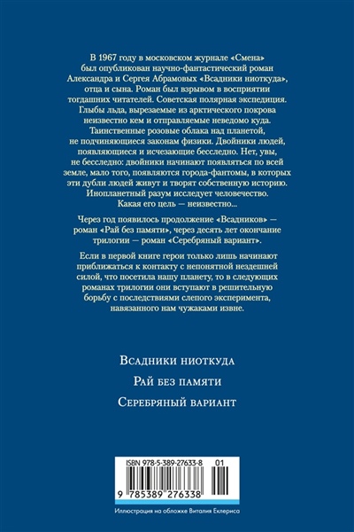 В 1967 году в московском журнале «Смена» был опубликован научно-фантастический роман Александра и Сергея Абрамовых «Всадники ниоткуда», отца и сына. Роман был взрывом в восприятии тогдашних читателей. Советская полярная экспедиция. Глыбы льда, вырезаемые из арктического покрова неизвестно кем и отправляемые неведомо куда. Таинственные розовые облака над планетой, не подчиняющиеся законам физики. Двойники людей, появляющиеся и исчезающие бесследно. Нет, увы, не бесследно: двойники начинают появляться по всей земле, мало того, появляются города-фантомы, в которых эти дубли людей живут и творят собственную историю. Инопланетный разум исследует человечество. Какая его цель — неизвестно… Через год появилось продолжение «Всадников» — роман «Рай без памяти», через десять лет окончание трилогии — роман «Серебряный вариант». Если в первой книге герои только лишь начинают приближаться к контакту с непонятной нездешней силой, что посетила нашу планету, то в следующих романах трилогии они вступают в решительную борьбу с последствиями слепого эксперимента, навязанного нам чужаками извне. По мнению некоторых читателей, «Град обреченный» (1975) братьев Стругацких — реплика на роман А. и С. Абрамовых «Рай без памяти». Возможно, спорить не станем.