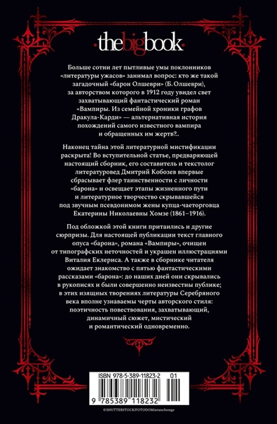 Больше сотни лет пытливые умы поклонников «литературы ужасов» занимал вопрос: кто же такой загадочный «барон Олшеври» (Б. Олшеври), за авторством которого в 1912 году увидел свет захватывающий фантастический роман «Вампиры. Из семейной хроники графов Дракула-Карди» — альтернативная история похождений самого известного вампира и обращенных им жертв?.. Наконец тайна этой литературной мистификации раскрыта! Во вступительной статье, предваряющей настоящий сборник, его составитель и текстолог литературовед Дмитрий Кобозев впервые сбрасывает флер таинственности с личности «барона» и освещает этапы жизненного пути и литературное творчество скрывавшейся под звучным псевдонимом жены купца-чаеторговца Екатерины Николаевны Хомзе (1861–1916). Под обложкой этой книги притаились и другие сюрпризы. Для настоящей публикации текст главного опуса «барона», романа «Вампиры», очищен от типографских неточностей и украшен иллюстрациями Виталия Еклериса. А также в сборнике читателя ожидает знакомство с пятью фантастическими рассказами «барона»: до наших дней они скрывались в рукописях и были совершенно неизвестны публике; в этих изящных творениях литературы Серебряного века вполне узнаваемы черты авторского стиля: поэтичность повествования, захватывающий, динамичный сюжет, мистический и романтический одновременно.
