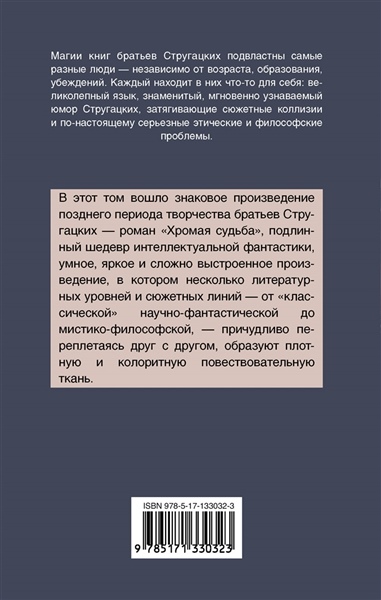 В этот том вошло знаковое произведение позднего периода творчества братьев Стругацкихроман Хромая судьба, подлинный шедевр интеллектуальной фантастики, умное, яркое и сложно-выстроенное произведение, в котором несколько литературных уровней и сюжетных линийот классической научо-фантастической до мистико-философской,причудливо переплетаясь друг с другом, образуют плотную и колоритную повествовательную ткань.